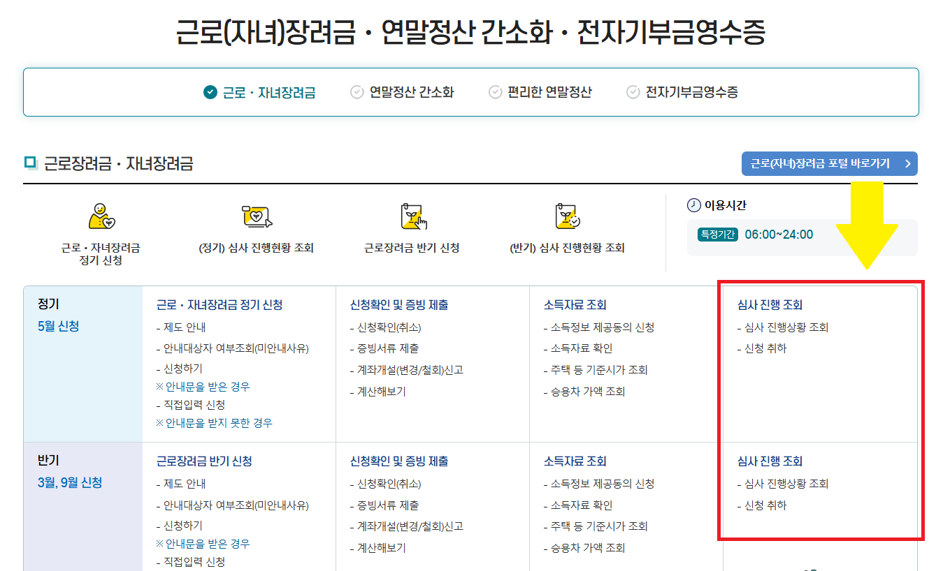 국세청 홈택스 > 장려금 신청 > 정기 근로장려금 및 자녀장려금 > 심사진행 상황조회