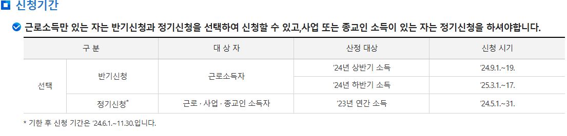 덧붙여 말씀드리자면 근로소득자는 반기 및 정기 신청 중 선택할 수 있지만, 근로소득 이외의 소득이 있거나 사업자인 경우에는 정기 신청만 가능하다는 점 유의하시기 바랍니다.