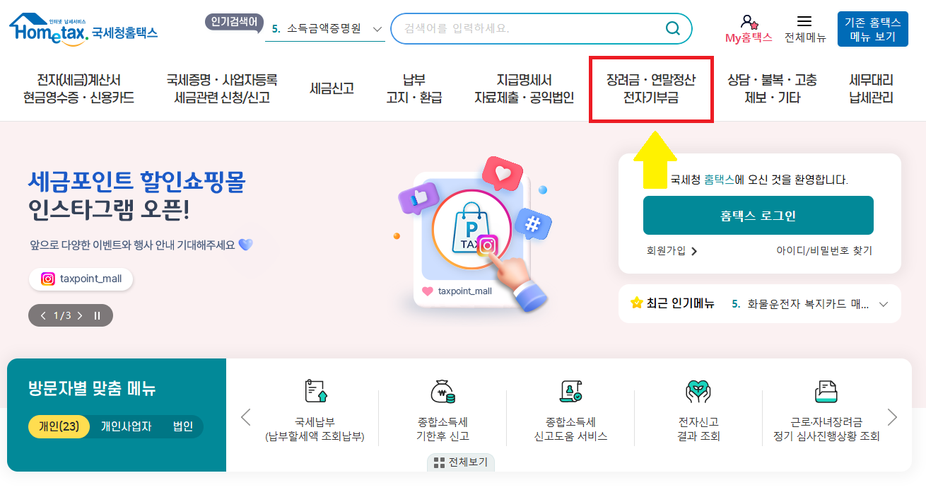 근로 장려금 및 자녀 장려금 확인은 국세청 홈택스 웹사이트에 접속하신 후 상단 메뉴 순서대로 클릭하시면 가능합니다.